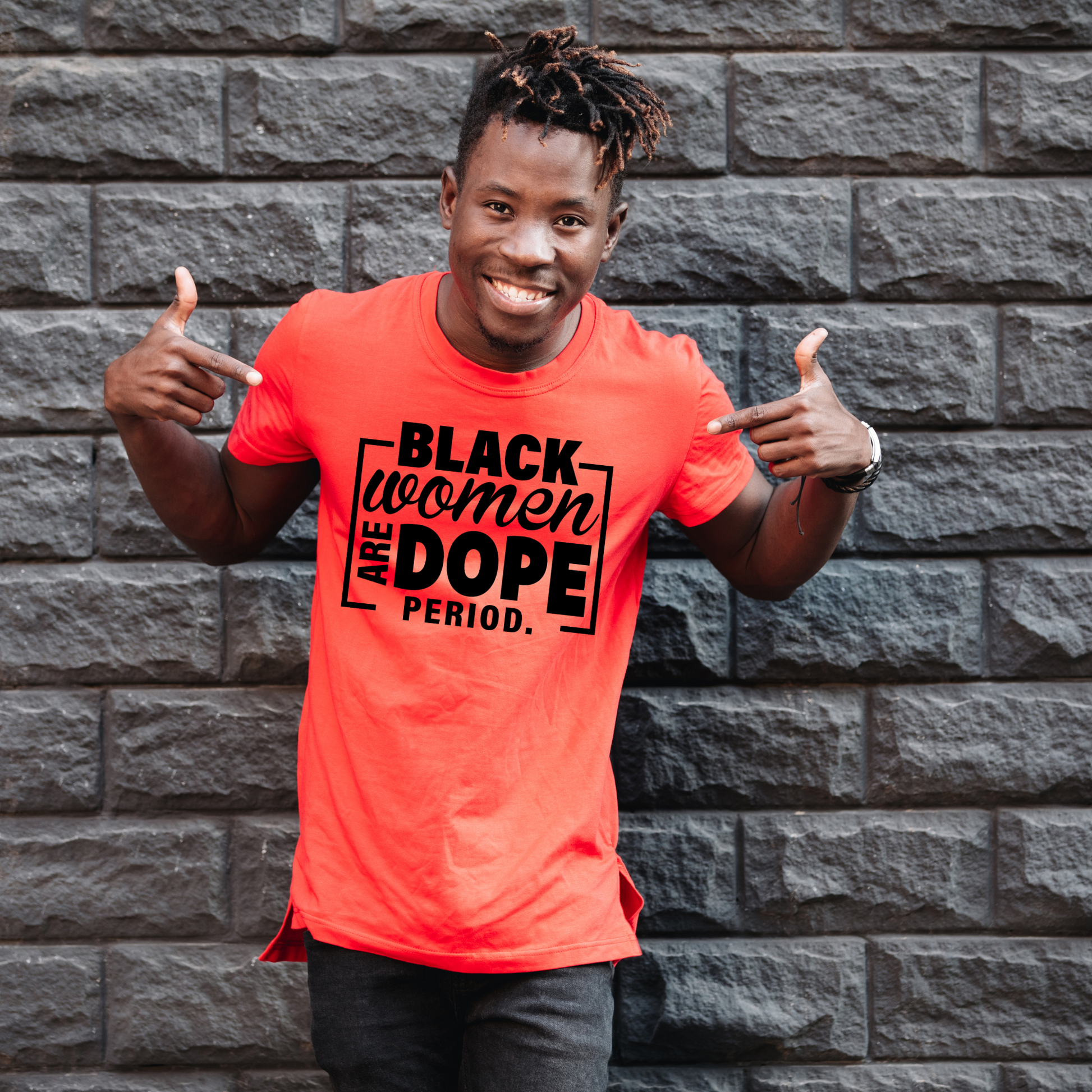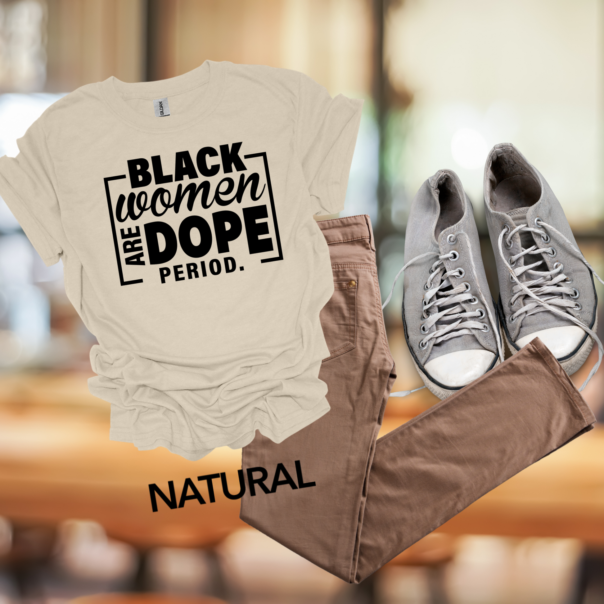 This shirt is available in black, white, natural (tan), red and gray, and says "Black women are dope..period"