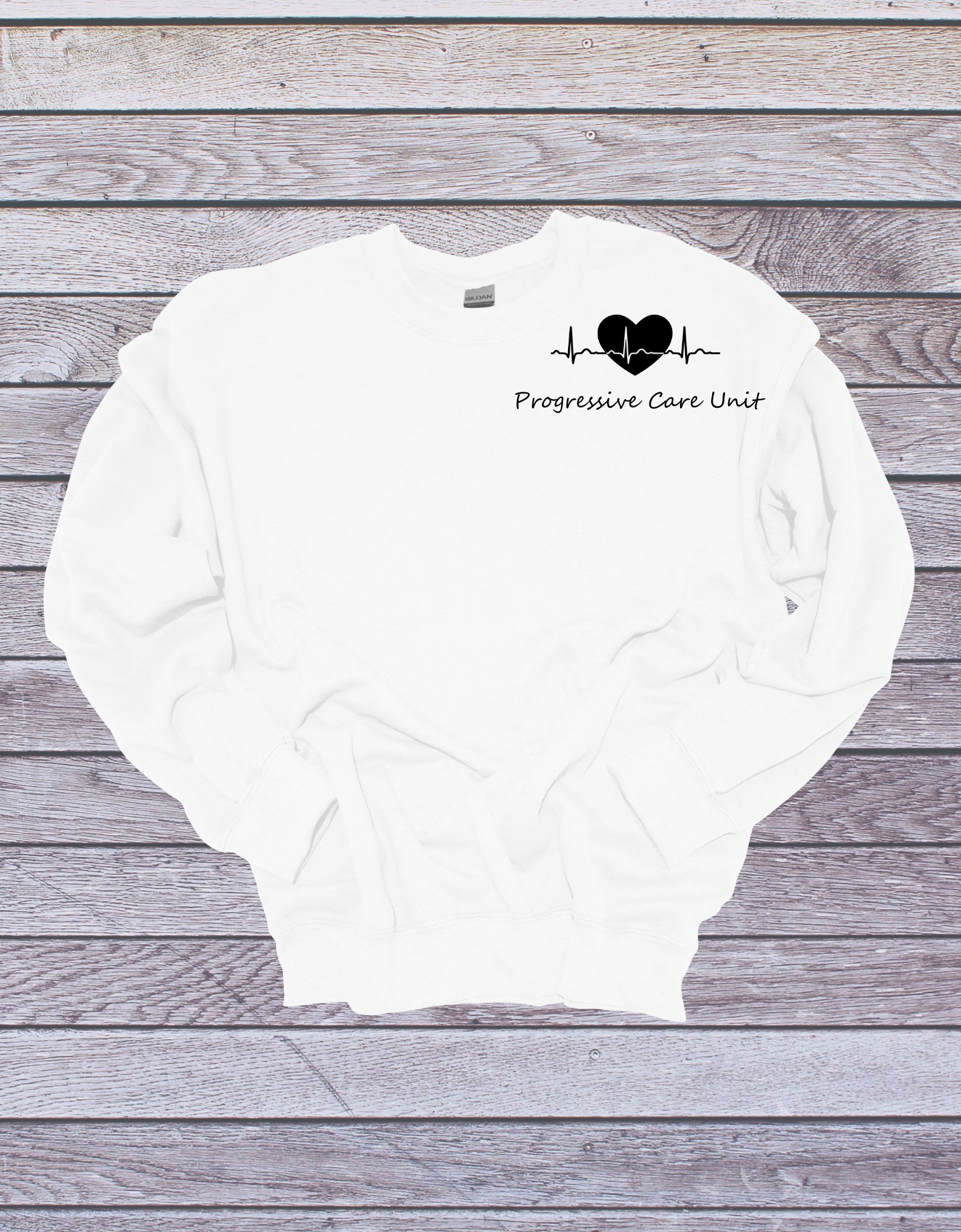 The front of the sweatshirt will have a heart with an EKG line as pictured, with the words "Progressive Care Unit" underneath. The ABCs will be on the back with the PQRST logo replaced by the EKG interpretation. Black sweatshirts will have white and red writing, Gray sweatshirts will have black and red writing, and the white sweatshirts will have black and red writing. This will be available in 3 colors and range from Small to 2XL. Please let me know if you need a size not listed, and I can accommodate.